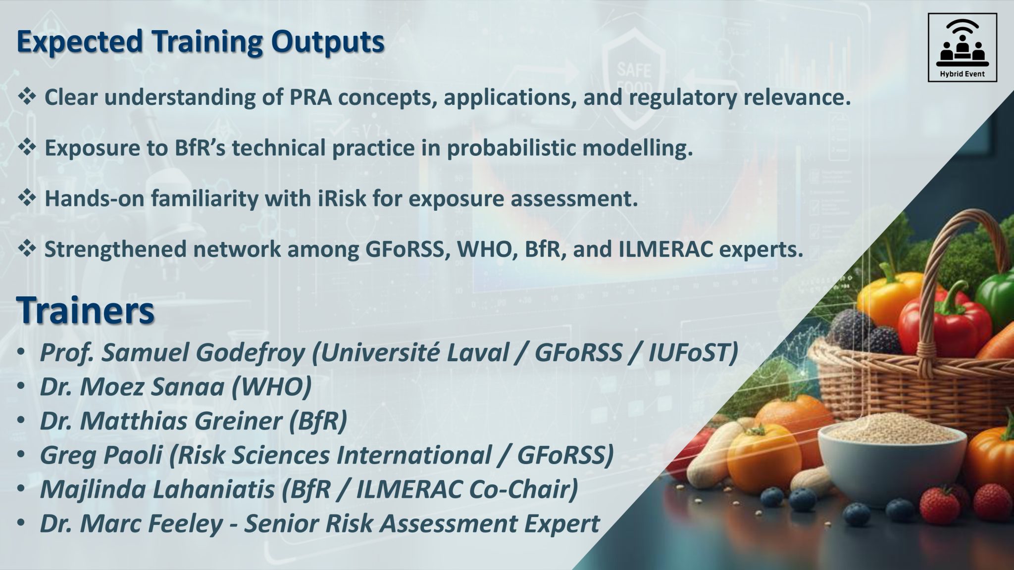 Hybrid Event • Training on Probabilistic Risk Assessment (PRA) for chemicals in food • 16 November 2025 • Dubai, UAE – Online 15 October 202515 October 2025Events, Training and Outreach, View All Training on Probabilistic Risk Assessment (PRA) for chemicals in food 16 November 2025 • Dubai, UAE • A Hybrid Event: In-Person & Virtual